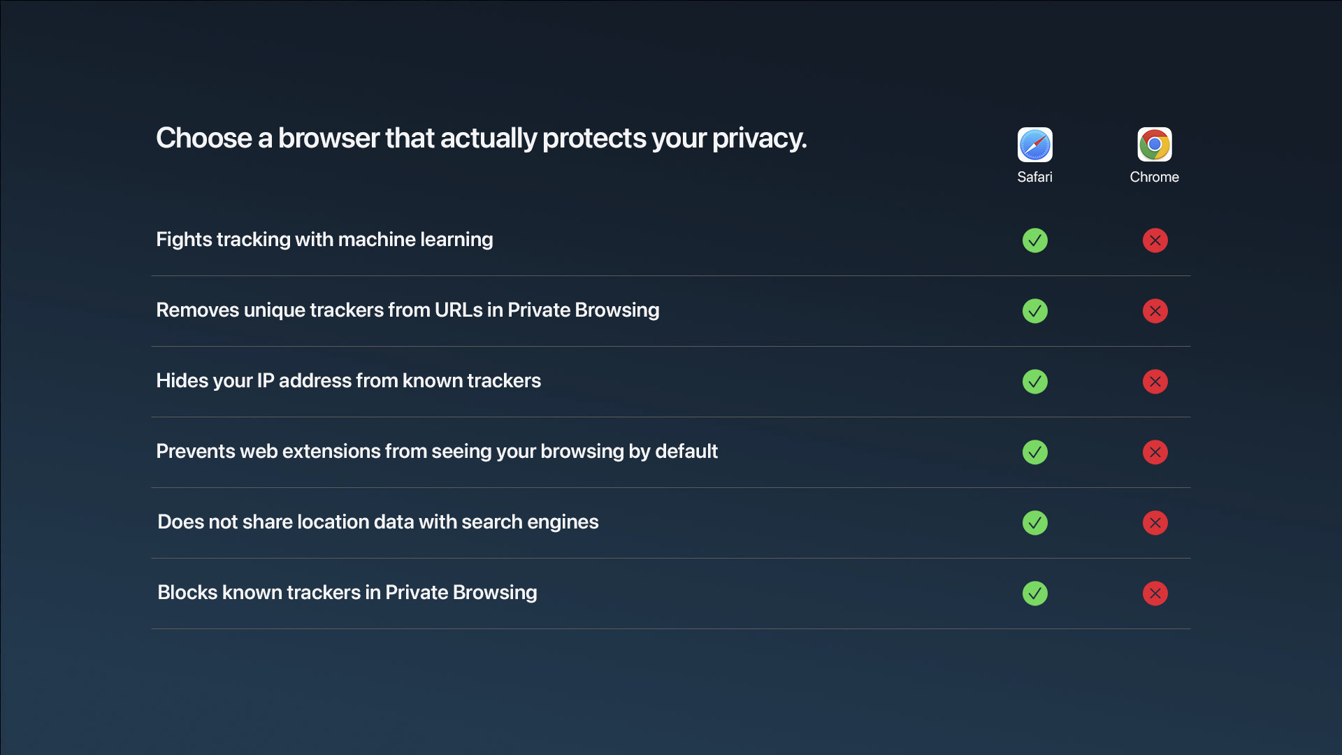 Cette publicité, appelée « Flock », a déjà cumulé près de 20 millions de vues. Elle illustre l’idée que Safari est plus respectueux des données personnelles, un argument que la firme de Cupertino met en avant dans plusieurs supports, dont un tableau comparatif très clair opposant Safari à Chrome.
