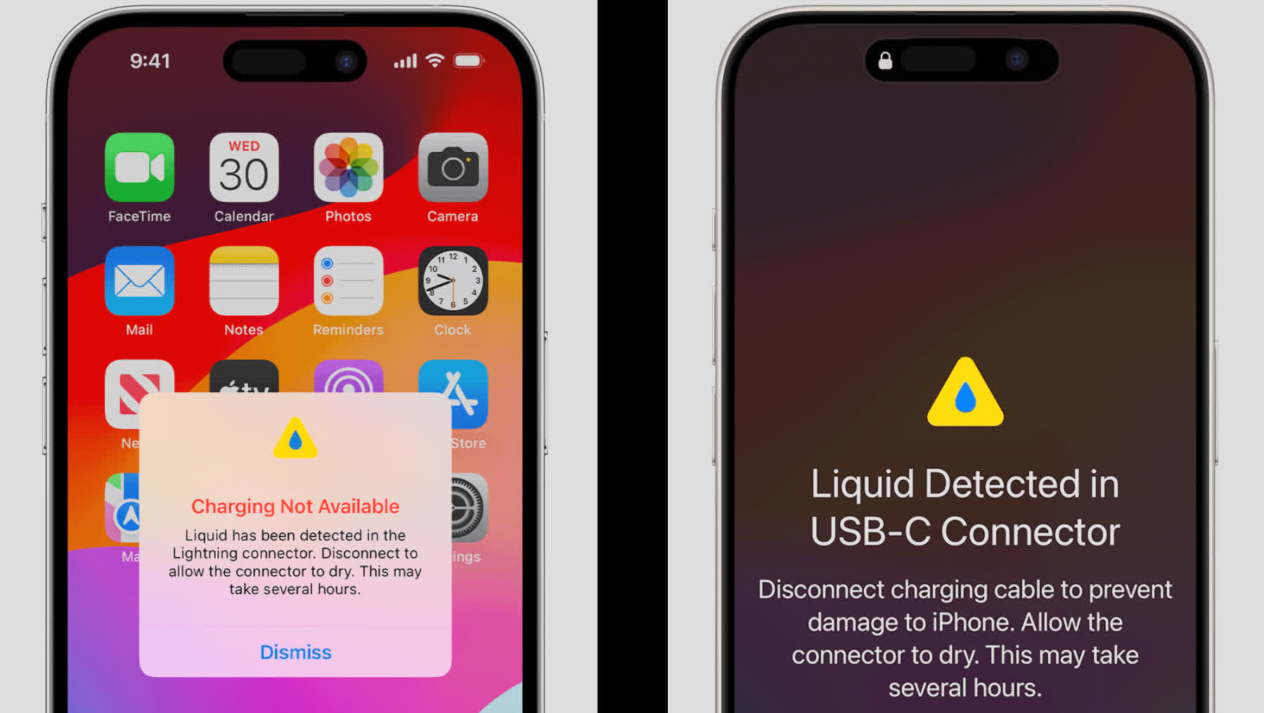 Apple déconseille les autres méthodes traditionnelles de séchage des téléphones, telles que l’air comprimé ou les sources de chaleur externes comme les sèche-cheveux. La société avertit également les utilisateurs de ne pas insérer de cotons-tiges, de serviettes en papier ou d’autres objets étrangers dans le connecteur.