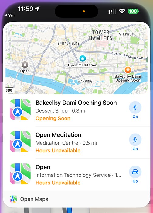 Siri apprend que je souhaite des indications et me dirige vers Apple Maps, sans tenir compte des meilleures options de transport. En revanche, elle reste complètement perdue sur la seconde question. Tout cela était évitable.