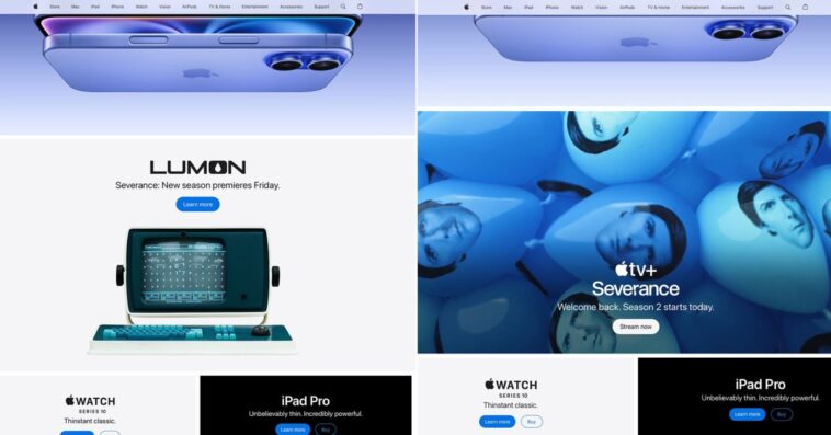 À ce jour, un panneau promotionnel a fait son apparition sur le site d’Apple. Celui-ci rivalise avec le célèbre iPhone 16 en termes de visibilité. Le premier visuel montre l’un des terminaux Lumon, plongé dans l’ambiance d’une photographie de produit Apple, rendant hommage à l’esthétique de la marque. L’aura de Severance est ainsi mise en avant, soulignant son attrait unique.