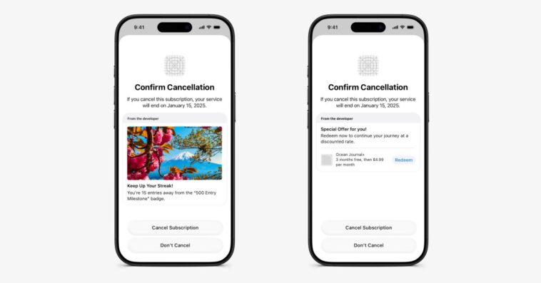 Les applications auront désormais la possibilité de montrer un message statique simple, d’afficher des informations dynamiques en fonction de l’état de l’utilisateur ou de proposer une offre spéciale pour inciter à maintenir l’abonnement. Par exemple, une application fictive comme Ocean Journal pourrait offrir trois mois gratuits avant que l’utilisateur ne confirme son annulation.