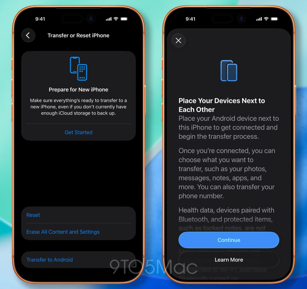 Ce cadre sera intégré à une nouvelle fonctionnalité “Transférer vers Android”, qui a été révélée pour la première fois en mai. Cette option, accessible sous Réglages > Général > Transférer ou Réinitialiser iPhone, informera l’utilisateur des données pouvant être transférées lors de la migration.