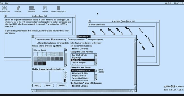“J’ai créé un système d’exploitation web en JS pur qui reproduit l’Apple Lisa Office System (1983-85). Le projet est encore en alpha et loin d’être exempt de bugs. (…) J’ai reconstitué l’interface utilisateur à partir de zéro ; tout s’affiche sur un seul élément de canevas. Ce n’est pas un thème CSS, et ce n’est pas un émulateur. (…) Chaque élément de l’interface – menus, fenêtres, contrôles – a été recréé manuellement.”