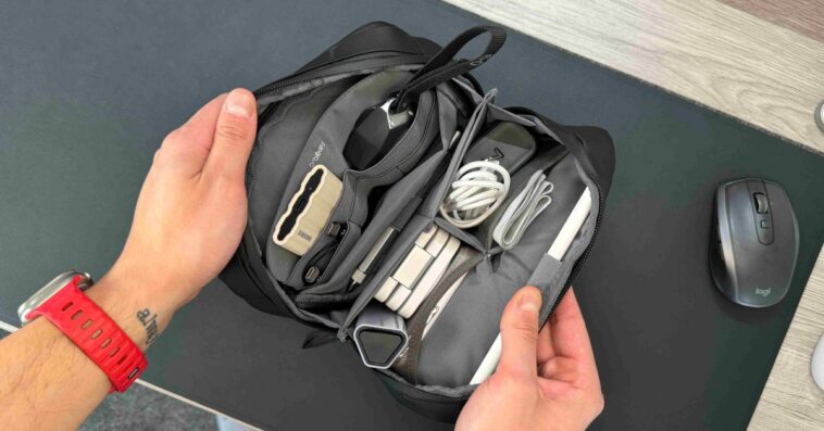 Qu’il s’agisse d’un petit voyage d’une nuit pour le travail ou de longues vacances, je finis toujours par être la personne qui emballe tous les éléments technologiques. Et je sais que je ne suis pas le seul à occuper ce poste. Habituellement, tous ces chargeurs et gadgets finissent dans un gros désordre au fond de mon sac. C’est un problème. Mais devinez quoi ? J’ai trouvé un moyen de tout garder propre et organisé dans une simple pochette technique. Je suis ravi de partager comment ce petit changement a facilité les voyages avec mes accessoires Apple préférés et de partager ce que je peux stocker !