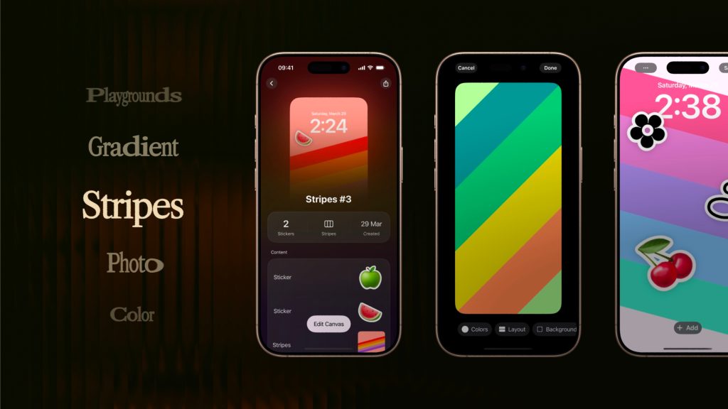 Deco se positionne comme l’une des solutions les plus accessibles pour concevoir un fond d’écran directement sur votre appareil, sans avoir besoin d’un logiciel de retouche photo. Pour commencer, choisissez un fond : une photo de votre galerie, des rayures, un dégradé personnalisable, une couleur unie, ou même une image générée par Image Playground (nécessite un appareil compatible avec l’intelligence d’Apple).