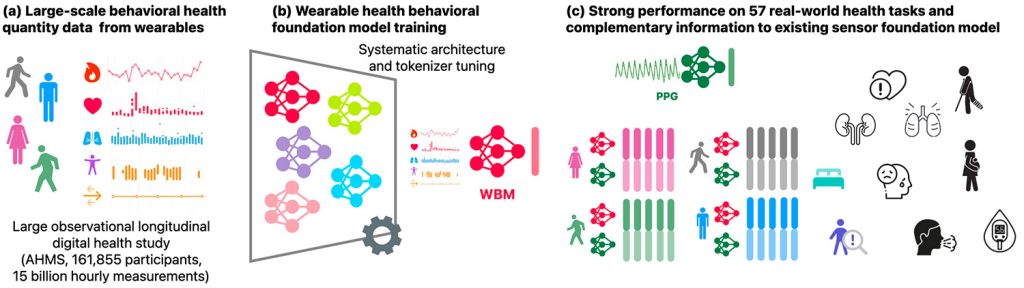Le WBM a été entraîné avec des données provenant de l’Apple Watch et de l’iPhone, impliquant 161 855 participants de l’AHMS. Plutôt que d’utiliser des flux de données bruts, le modèle a été alimenté avec 27 indicateurs comportementaux compréhensibles par l’homme, tels que l’énergie active, le rythme de marche, et la durée du sommeil.