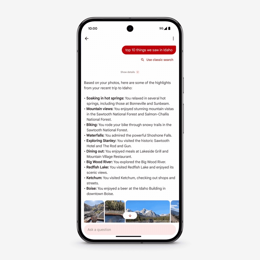 Ask Photos est une expérience de recherche conversationnelle qui exploite les modèles Gemini pour « comprendre le contexte de votre galerie de photos — comme les personnes les plus importantes de votre vie, vos passe-temps ou vos aliments préférés — et extraire des détails pertinents pour vous aider à trouver des souvenirs spécifiques et à découvrir des informations sur votre vie. »