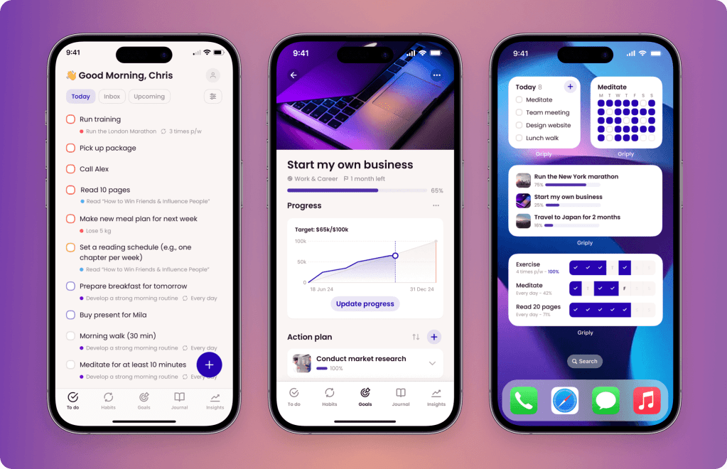 La conception de Griply repose sur une réalité qui frappe : nombreux sont ceux qui établissent des objectifs, comme une résolution du Nouvel An, sans jamais parvenir à les réaliser. L’application a donc pour mission de réduire cet écart en transformant les objectifs en étapes concrètes.