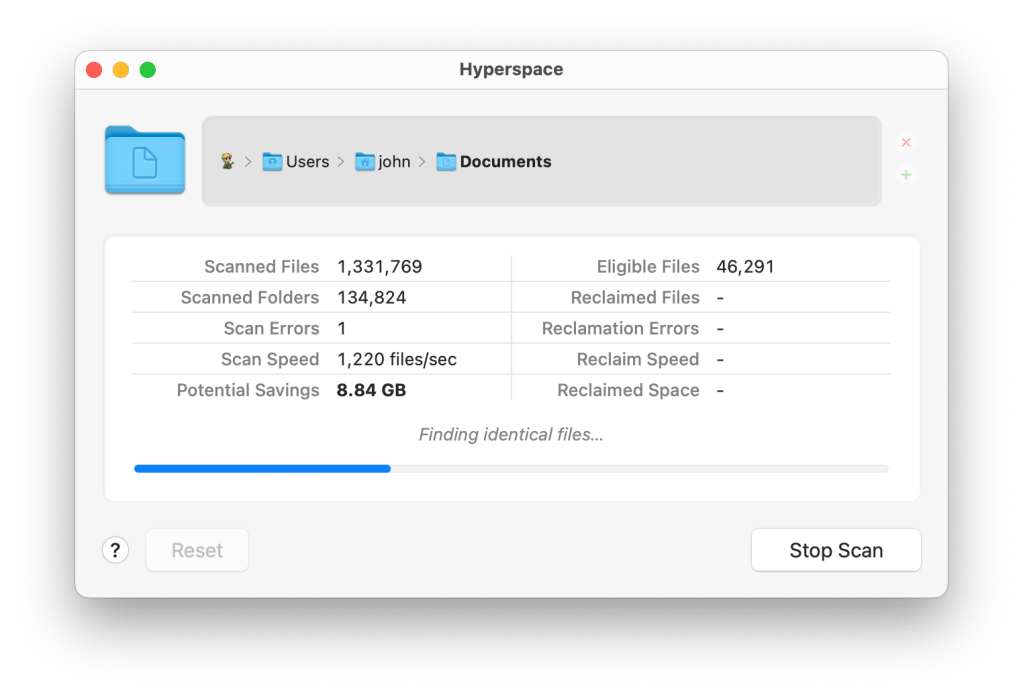 La simplicité est au cœur de son utilisation. Il suffira de télécharger l’application depuis le Mac App Store, de l’ouvrir, et de spécifier le dossier à analyser. Hyperspace se met alors au travail, cherchant des opportunités de stockage à récupérer. L’application vous informera du montant potentiel d’espace disque à retrouver.
