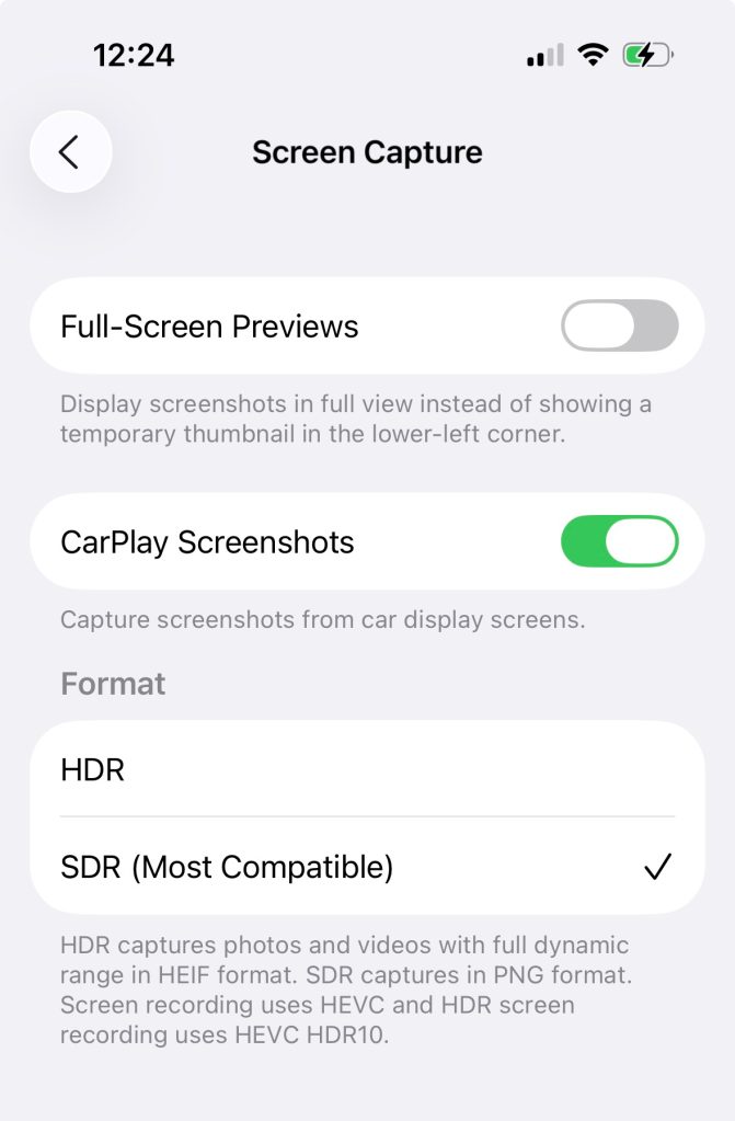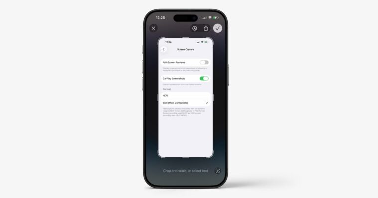 Au-delà de la désactivation du mode plein écran, iOS 26 propose aussi des options supplémentaires. Dans le même menu des réglages, vous pouvez activer ou désactiver les captures d’écran CarPlay. Si vous êtes connecté à un véhicule avec CarPlay, prendre une capture sur votre iPhone peut aussi enregistrer l’affichage de l’écran de la voiture. Si cela ne vous intéresse pas, rien de plus simple : désactivez cette option.