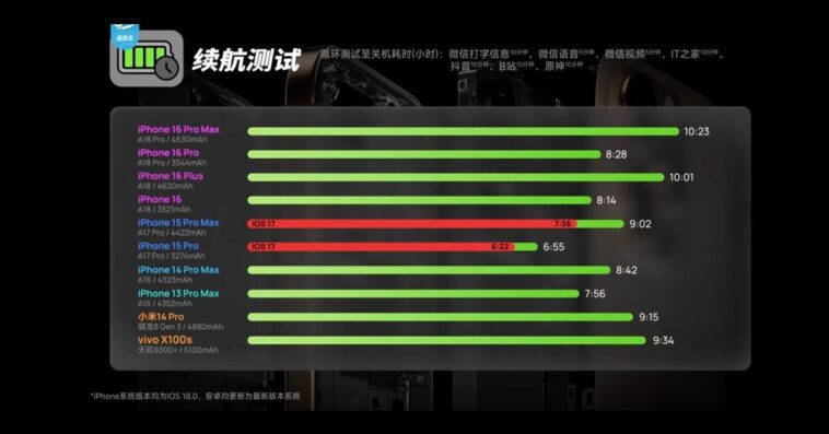 Geekerwan a soumis les nouveaux modèles à un test de batterie rigoureux. Les résultats sont frappants : le iPhone 16 Pro Max a établi un nouveau record avec plus de 10 heures d’autonomie. Ce n’est pas juste une amélioration mineure, mais une avancée significative par rapport à ses prédécesseurs. En comparaison, le 15 Pro Max, après avoir été mis à jour vers iOS 18, a également bénéficié de gains notables.