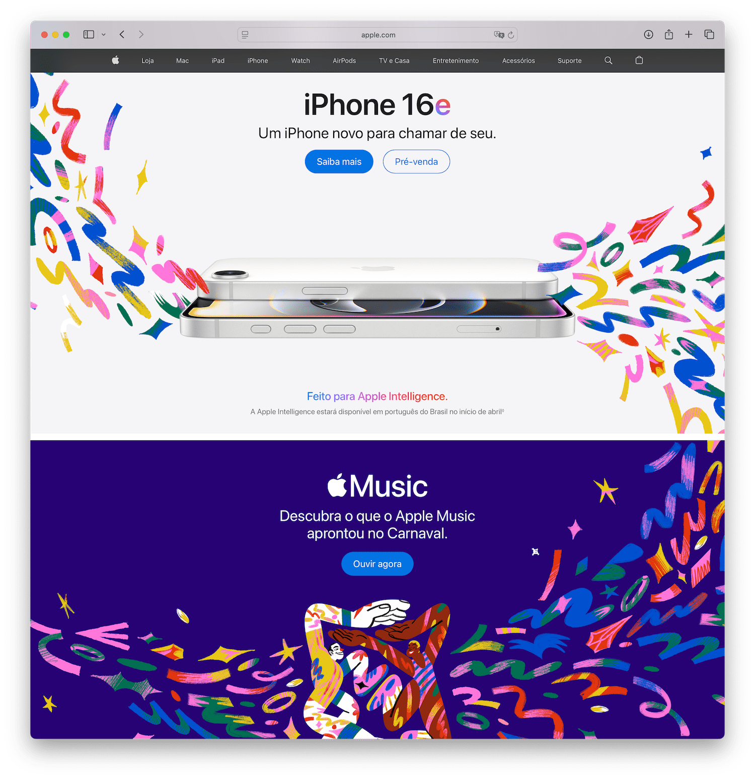 Pour célébrer le Carnaval, Apple a relooké son site brésilien avec un thème festif. Les derniers modèles comme l’iPhone 16e et les AirPods 4 sont présentés avec des confettis, captivant ainsi l’esprit joyeux de cette période. Par ailleurs, une nouvelle section sur Apple Music propose des playlists spécialement conçues pour l’événement.