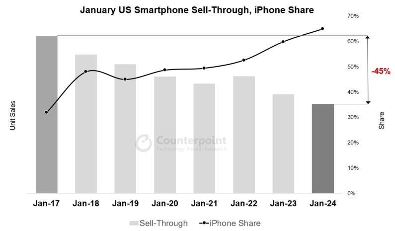 Counterpoint Research n’a pas détaillé les choses, mais a commencé en notant la dépression persistante sur le marché américain des smartphones dans son ensemble.