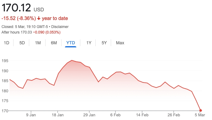 Le cours de l’action Apple a connu une forte baisse au cours des dernières semaines, atteignant aujourd’hui son plus bas niveau pour l’année, clôturant à 170,12 $.