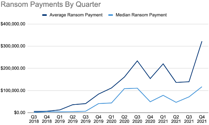 En chiffres, le paiement moyen de la rançon au quatrième trimestre 2021 a atteint 322 168 dollars, soit 130 % de plus qu’au trimestre précédent. Le montant médian du paiement de la rançon était de 117 116 $, en hausse de 63 % par rapport au troisième trimestre.