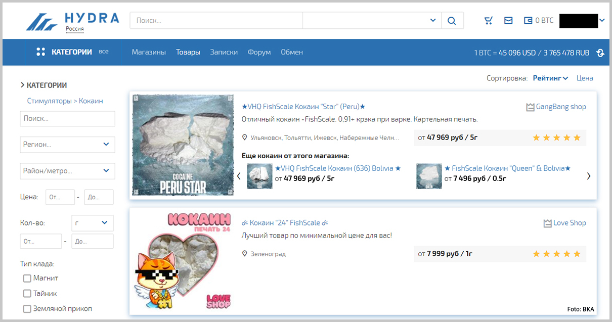 Outre les services de stupéfiants et de blanchiment d’argent, qui étaient l’objectif principal, Hydra proposait également des bases de données volées, des documents falsifiés et des services de piratage contre rémunération.