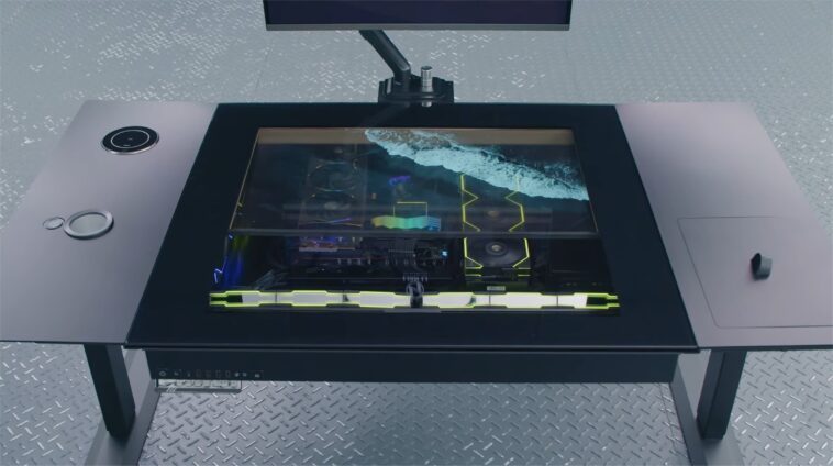En un mot: Lian Li a partagé ce qui pourrait être la prochaine entrée de sa série de bureaux debout ; Je dis « pourrait être » car il s’agit encore d’un prototype pour le moment. Le nouveau bureau réglable en hauteur DK-07 est doté d’un plateau en verre qui recouvre la zone PC. Il est entouré d’aluminium, mais la caractéristique la plus remarquable est sans aucun doute l’écran OLED transparent LG à écran large de 30 pouces sous le verre qui sert de moniteur secondaire pour votre système.