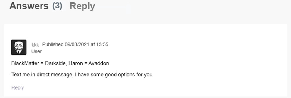 Les choses sont devenues claires début septembre lorsque le groupe, par l’intermédiaire d’un utilisateur connu sous le nom de « kkk », a répondu dans un fil de discussion sur des programmes de ransomware « réputés » qu’il recherchait des partenaires ayant déjà accès aux réseaux de l’entreprise.
