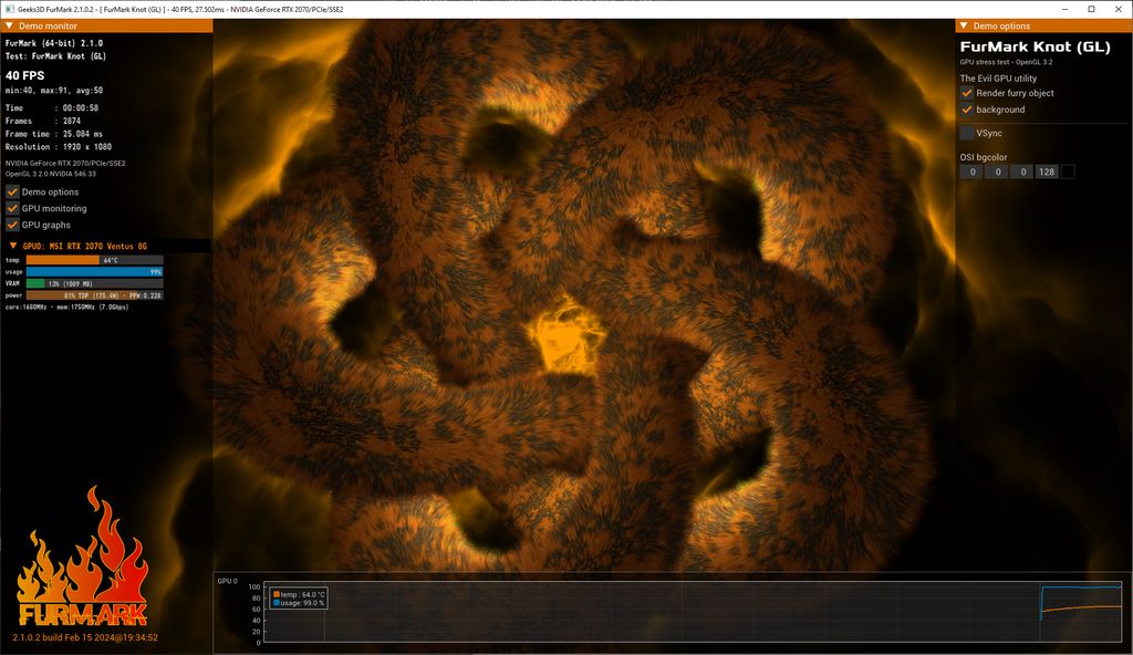 FurMark 2 est construit avec GeeXLab. L’interface graphique est une pure application GeeXLab tandis que l’outil de ligne de commande furmark est construit avec le SDK GeeXLab. GeeXLab étant multiplateforme, cette première version de FurMark 2 est disponible pour Windows et Linux (la version Linux 32 bits est également disponible, je la recompilerai pour la prochaine mise à jour). Je prévois de sortir FurMark 2 pour Raspberry Pi (je viens de recevoir ma carte rpi5 !) et peut-être aussi pour macOS.