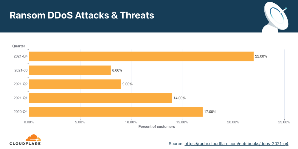 Au quatrième trimestre de l’année dernière, environ un quart des clients de Cloudflare qui ont été la cible d’une attaque DDoS ont déclaré avoir reçu une demande de rançon de l’auteur.