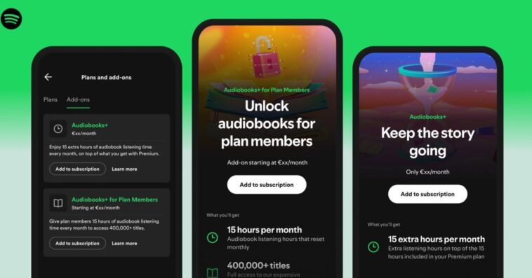 - Audiobooks+ pour les membres de plan : Pour la première fois, les membres supplémentaires des plans Premium Family et Duo peuvent accéder à ces 15 heures mensuelles d’écoute grâce à cet ajout récurrent. Ils doivent simplement demander l’accès à l’audiobook à leur gestionnaire de plan, qui pourra acheter l’option pour eux. Un complément ponctuel de 10 heures est également disponible si besoin avant le renouvellement du cycle de facturation mensuel.