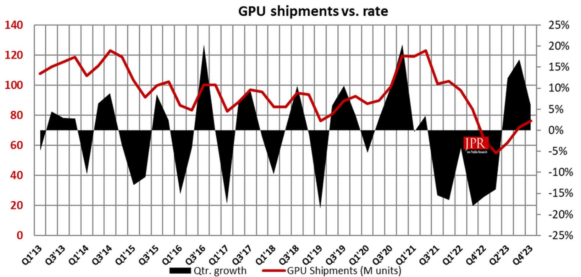 Qu’est-ce qui vient de se passer? Alors que le marché des PC continue de se redresser après quelques années décevantes, les livraisons de CPU et de GPU ont enregistré une croissance substantielle au cours du quatrième trimestre de l’année dernière. Selon Jon Peddie Research (JPR), le marché des cartes graphiques pour PC a augmenté de 20 % sur un an pour atteindre 76,2 millions d’unités au quatrième trimestre 2023, tandis que les livraisons de processeurs pour PC ont augmenté de 24 % sur un an.