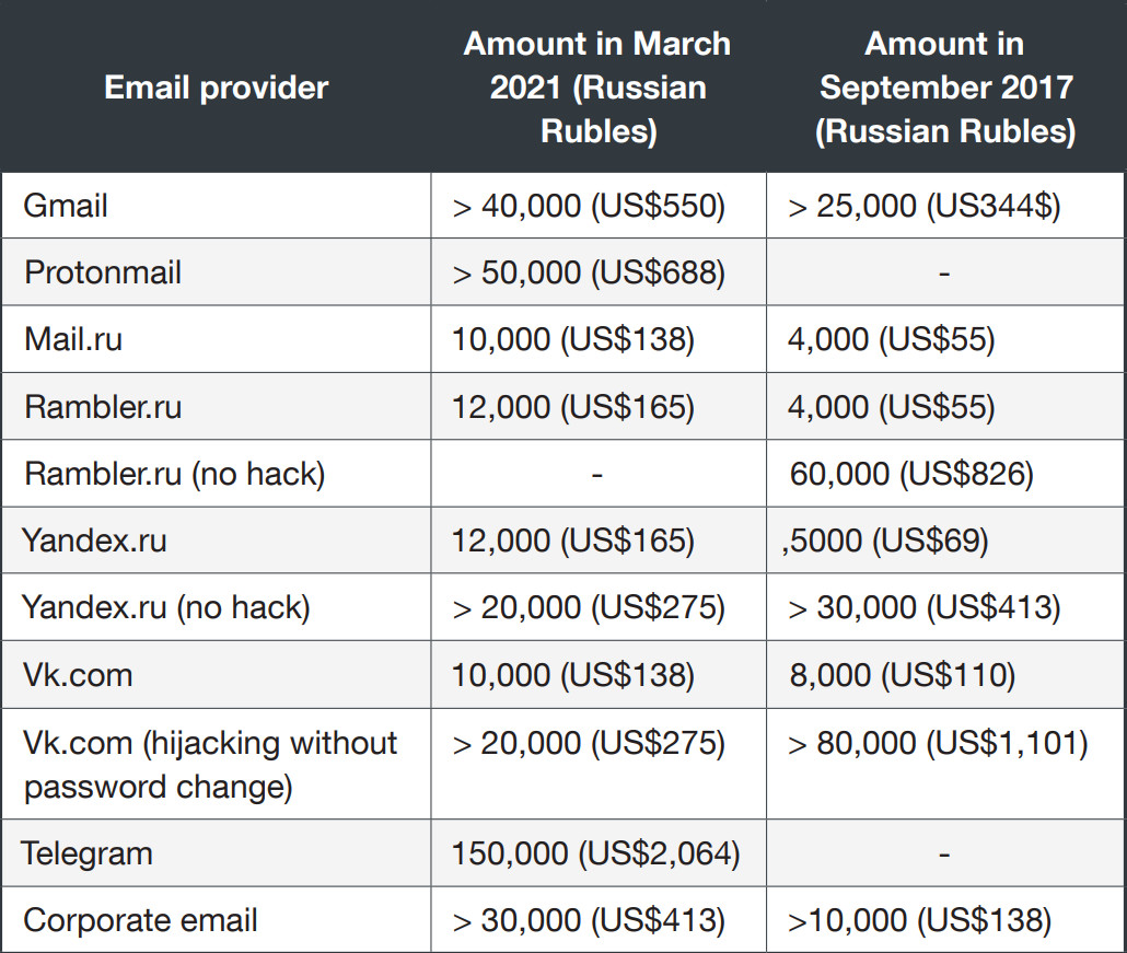 Les services comprenaient l’accès gratuit à la messagerie Web (Gmail, Protonmail, Mail.ru, Yandex, VK), aux médias sociaux (Telegram) et aux comptes de messagerie d’entreprise. Les pirates offriraient aux clients des copies des boîtes aux lettres piratées.