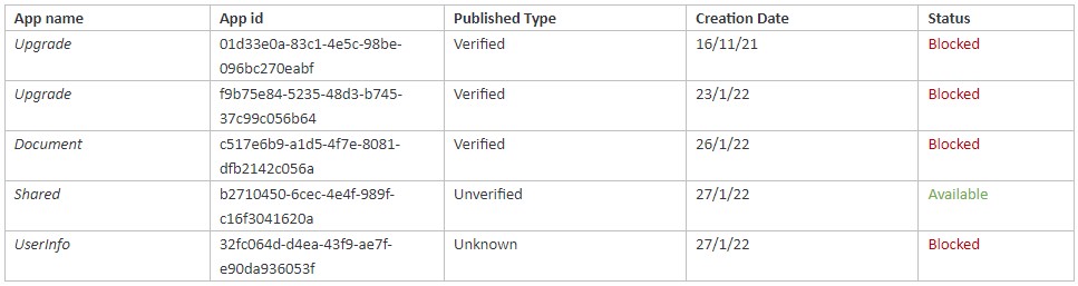 Les acteurs à l’origine de la campagne OiVaVoii ont utilisé au moins cinq applications OAuth malveillantes, dont quatre sont actuellement bloquées : « Upgrade », « Document », « Shared » et « UserInfo ».