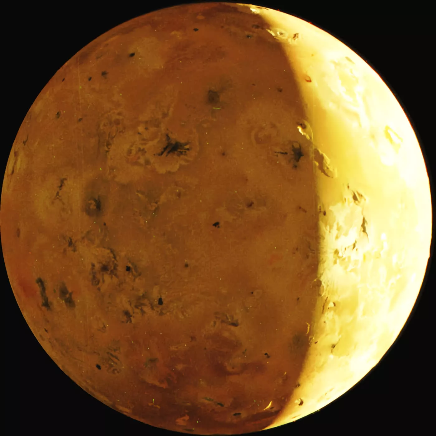 Les images montrent ce qui semble être de nombreux cratères d’impact. Cependant, la lave comble rapidement les impacts, ne laissant aucune trace. Les taches sombres (ci-dessous) sont les restes de volcans effondrés. Des coulées de lave massives finiront également par les enterrer.