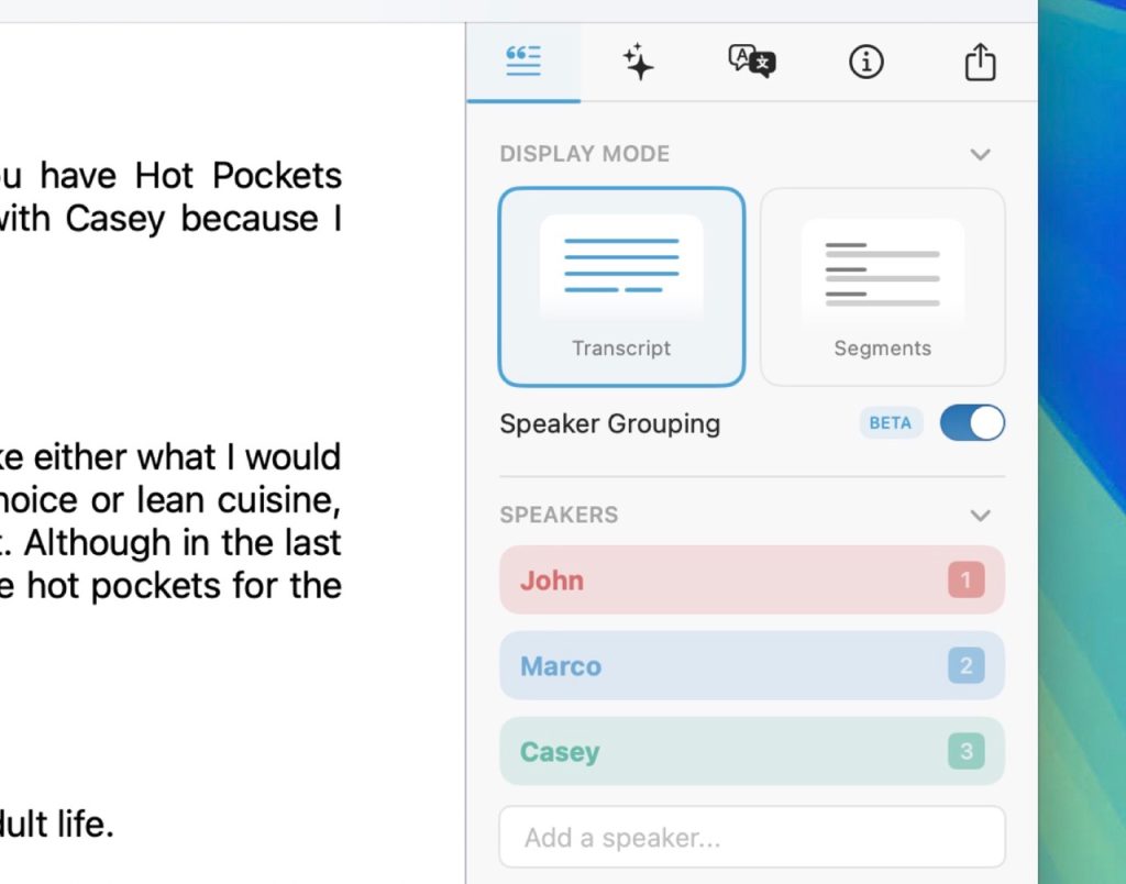 C’est une véritable révolution. Grâce à notre collaboration avec ArgMax et leurs modèles WhisperKit Pro et SpeakerKit, nous sommes fiers d’introduire la reconnaissance des locuteurs sur Mac. Tous les traitements se font en toute confidentialité sur votre appareil, sans données envoyées sur un serveur, et fonctionnent hors ligne. Pour commencer, il suffit de transcrire votre audio, d’assigner des noms à chaque locuteur et le tour est joué.