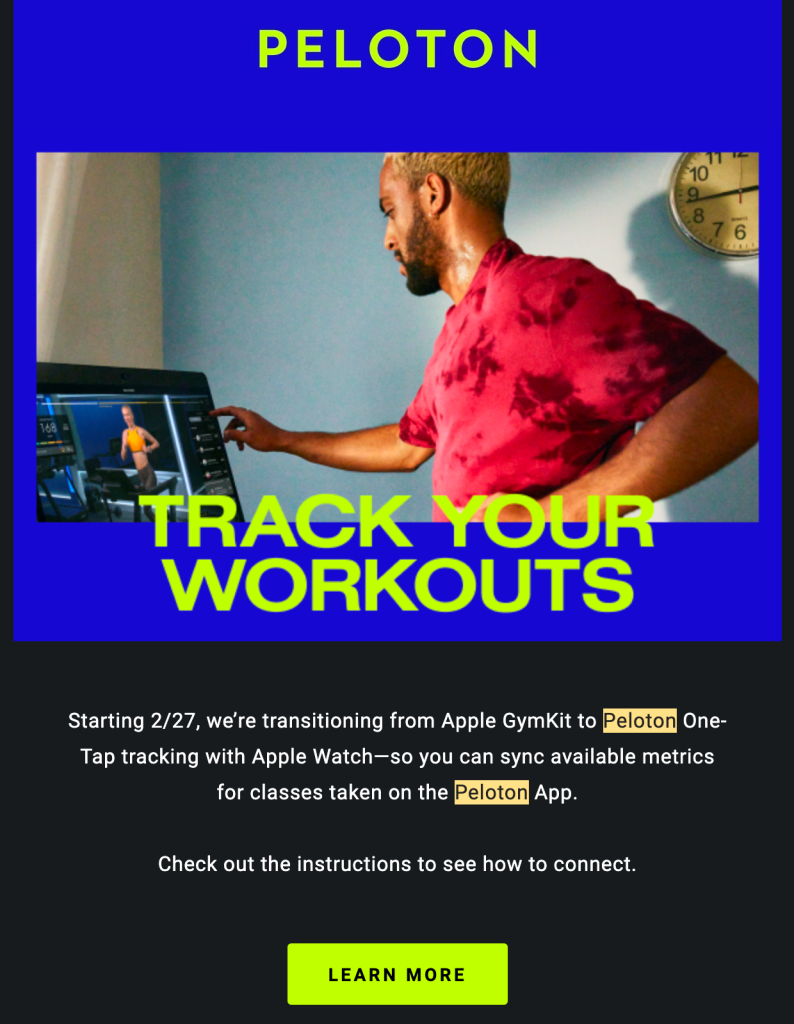 Plus tôt cette semaine, Peloton a envoyé un e-mail aux membres pour leur faire savoir qu’à partir du 27 février, la société passerait d’Apple GymKit au suivi Peloton One-Tap avec Apple Watch.