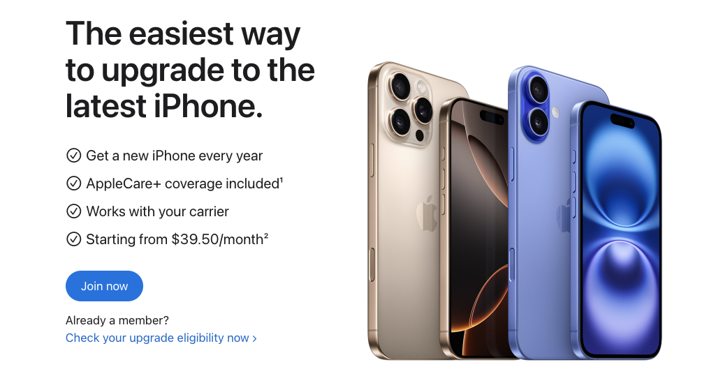 Si vous envisagez de mettre à niveau votre appareil, vérifiez votre éligibilité pour le Programme de Mise à Niveau d’Apple. Ce programme propose un paiement mensuel à partir de 39,50 €/mois pour l’iPhone 16. Vous pouvez également échanger votre ancien appareil contre un crédit sur votre carte-cadeau Apple Store, une option qui vous sera proposée lors de votre commande.