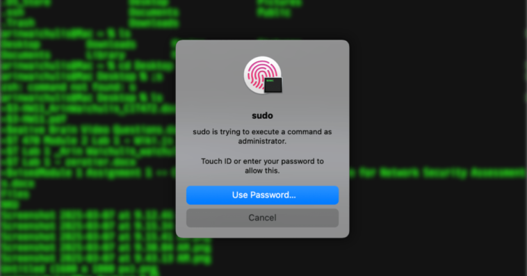 Pour vous assurer que tout fonctionne correctement, ouvrez une nouvelle session Terminal et exécutez une commande sudo. Vous devriez désormais pouvoir utiliser Touch ID pour l’authentification au lieu de devoir saisir votre mot de passe. Si jamais vous souhaitez revenir à l’ancien système, il vous suffit de commenter la ligne d’authentification que vous avez modifiée.