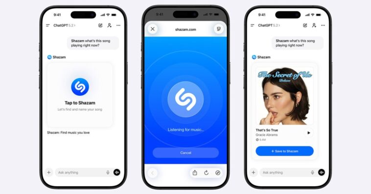 Il y a quelques mois, Apple a intégré Apple Music à ChatGPT, facilitant la création de playlists. Aujourd’hui, c’est au tour de Shazam de rejoindre l’aventure. Les utilisateurs peuvent désormais poser des questions comme “Shazam, quelle chanson passe ?” ou “Shazam, quelle est cette musique ?” pour identifier un titre sans avoir à quitter le chatbot.