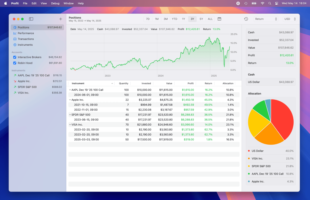 Pour les investisseurs, la gestion de différents comptes peut rapidement devenir un véritable casse-tête. Avec Profit, fini le désordre : cette application centralise tous vos actifs dans une interface soignée, aussi bien pour iOS que pour macOS. Pas besoin de synchronisation des comptes, tout fonctionne en toute autonomie et en toute sécurité.