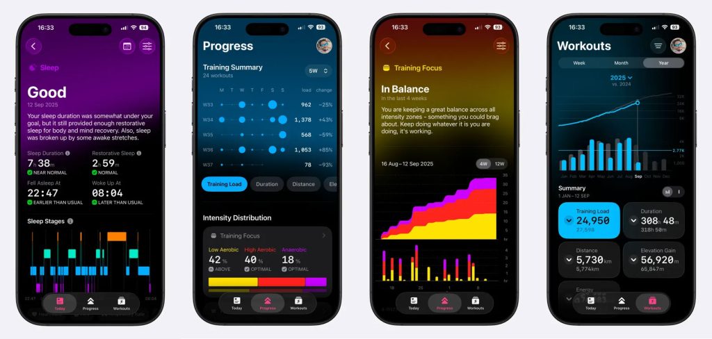 Un autre point fort de l’application est l’analyse détaillée des séances d’entraînement. Elle offre également un suivi des trajets, encouragée par une attention particulière à la récupération, surtout pour les utilisateurs qui portent leur Apple Watch durant la nuit, ce qui permet une surveillance plus précise des données.