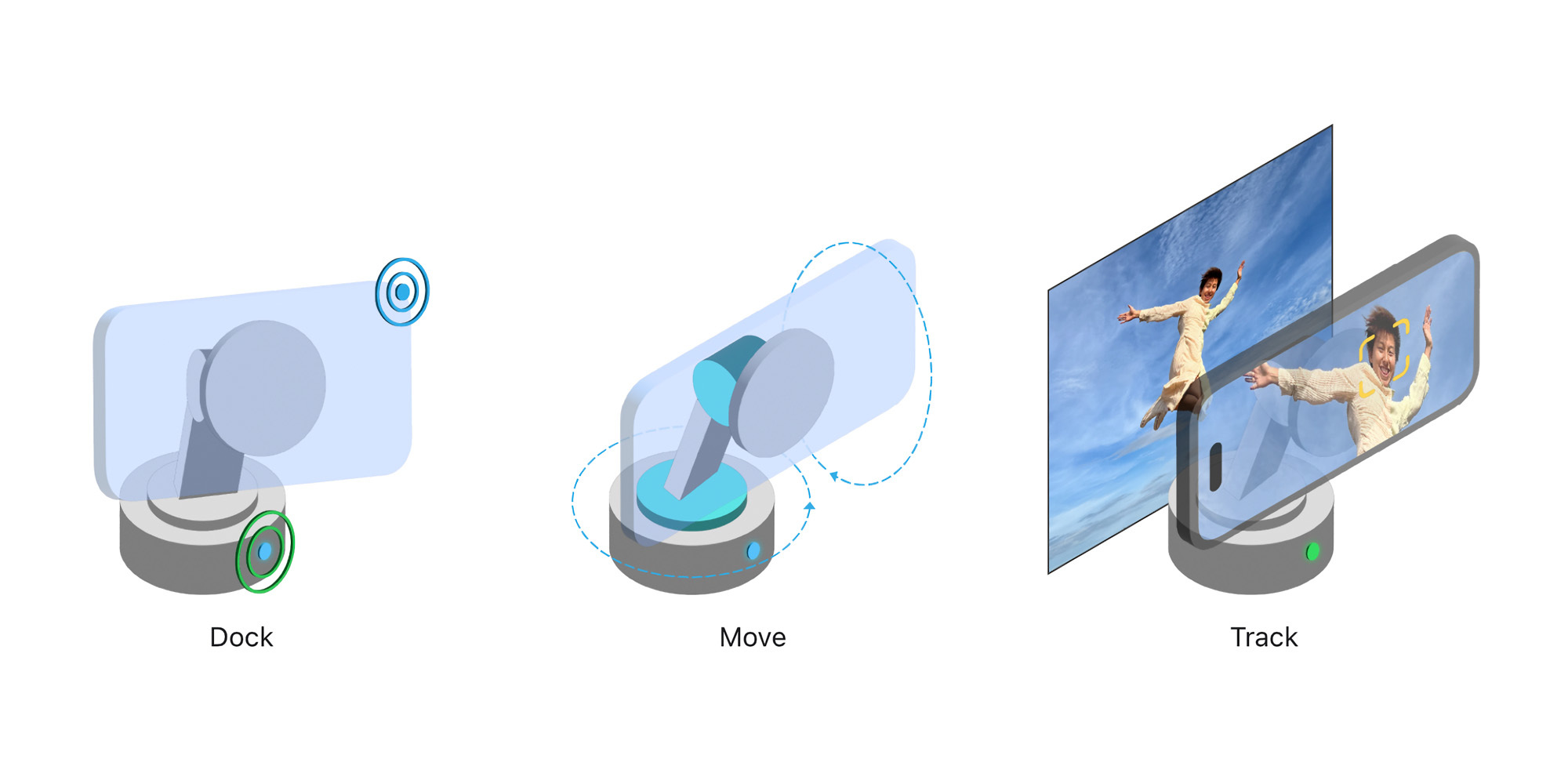 DockKit s’interface avec des supports motorisés compatibles DockKit, appelés accessoires de station d’accueil, pour suivre l’emplacement des objets qui apparaissent dans les images vidéo. Il détermine la meilleure façon de positionner l’appareil photo de l’iPhone pour cadrer et suivre les objets, avec un suivi amélioré des personnes grâce au suivi combiné du corps et du visage pour les sujets humains. Cette fonctionnalité, appelée suivi système, démarre automatiquement dès qu’une personne connecte l’iPhone à un support motorisé compatible et lance l’application Appareil photo.