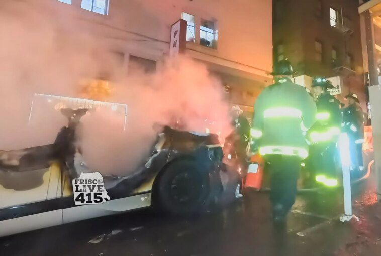 se passe MAINTENANT à SF. Voiture Waymo vandalisée et incendiée ð¤¯@sfchronique pic.twitter.com/OEZYFiy6mv
