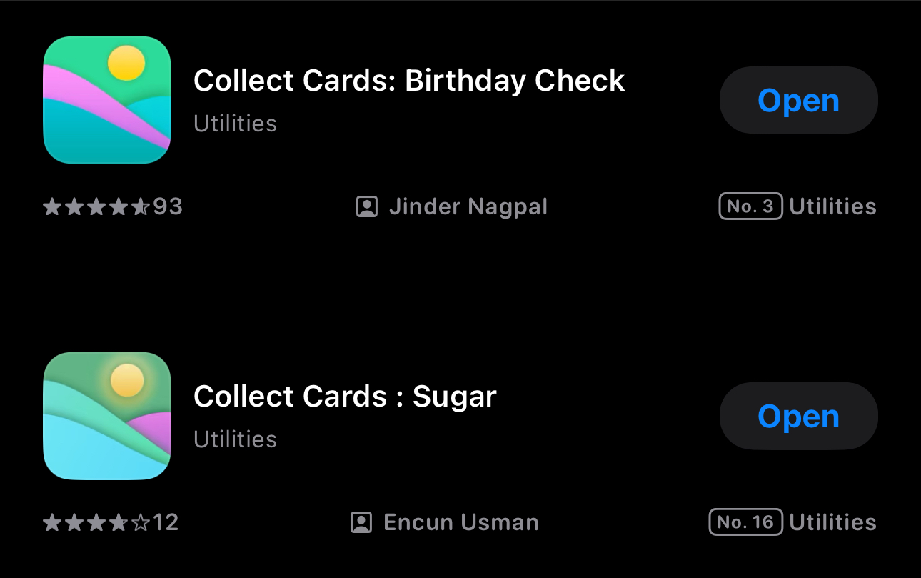 Les applications sont connues sous le nom de « Collect Cards » et sont publiées par des développeurs différents, même si elles sont à peu près identiques. Comme nous l’avons détaillé dans notre précédent rapport, la description et la capture d’écran des applications montrent une interface simple qui n’a rien à voir avec le streaming.